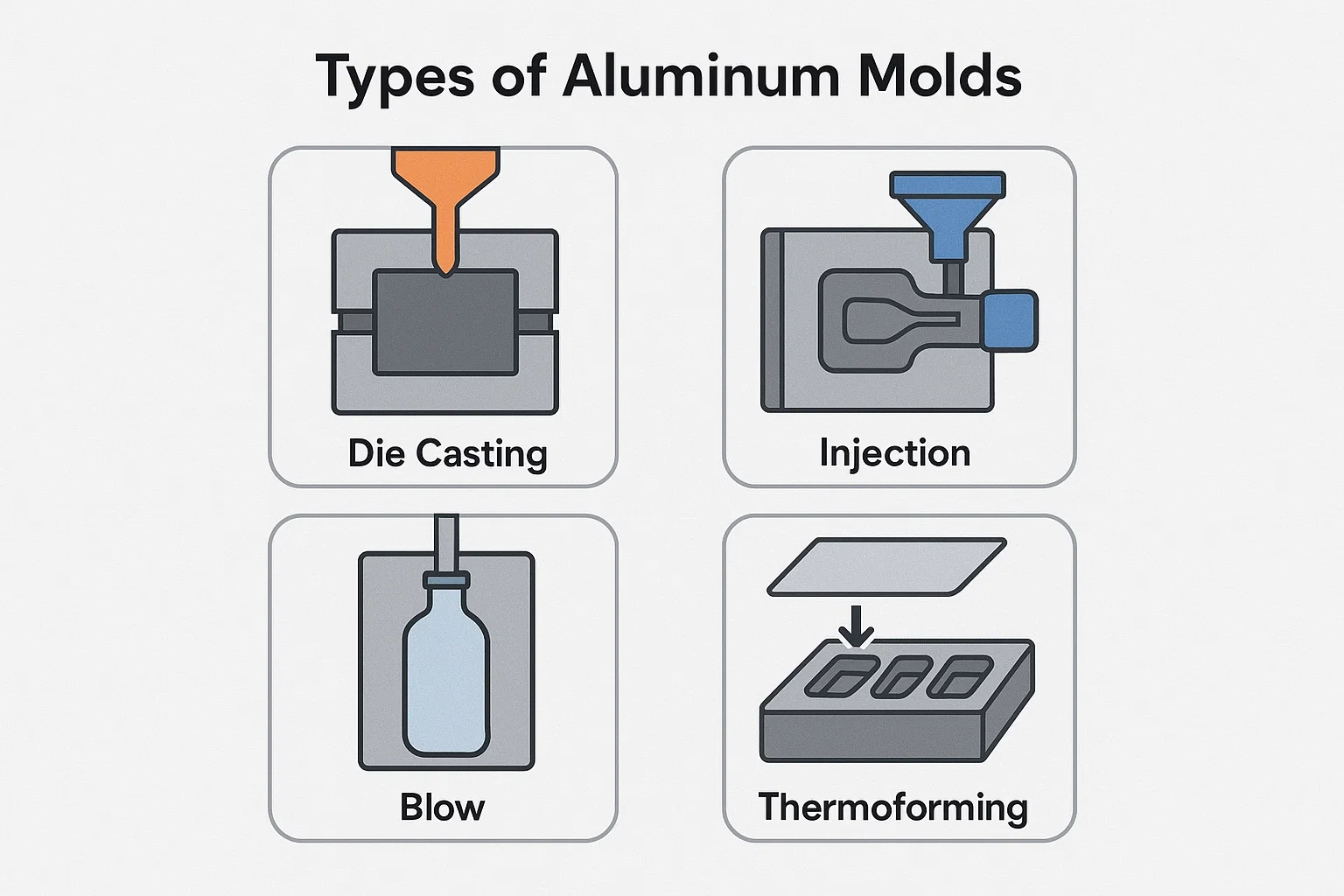 Acuan suntikan: Ini mungkin aplikasi yang paling biasa untuk acuan aluminium. Pencetakan suntikan melibatkan suntikan plastik cair ke dalam acuan di bawah tekanan tinggi. Ciri -ciri menonjol aluminium di sini adalah keupayaannya untuk menghilangkan haba dengan cepat. Ini bermakna plastik menguatkan lebih cepat, secara dramatik memendekkan "masa kitaran" - masa yang diperlukan untuk menghasilkan satu bahagian. Bagi pengilang, masa kitaran yang lebih cepat diterjemahkan terus ke kecekapan pengeluaran yang lebih tinggi dan kos yang lebih rendah.