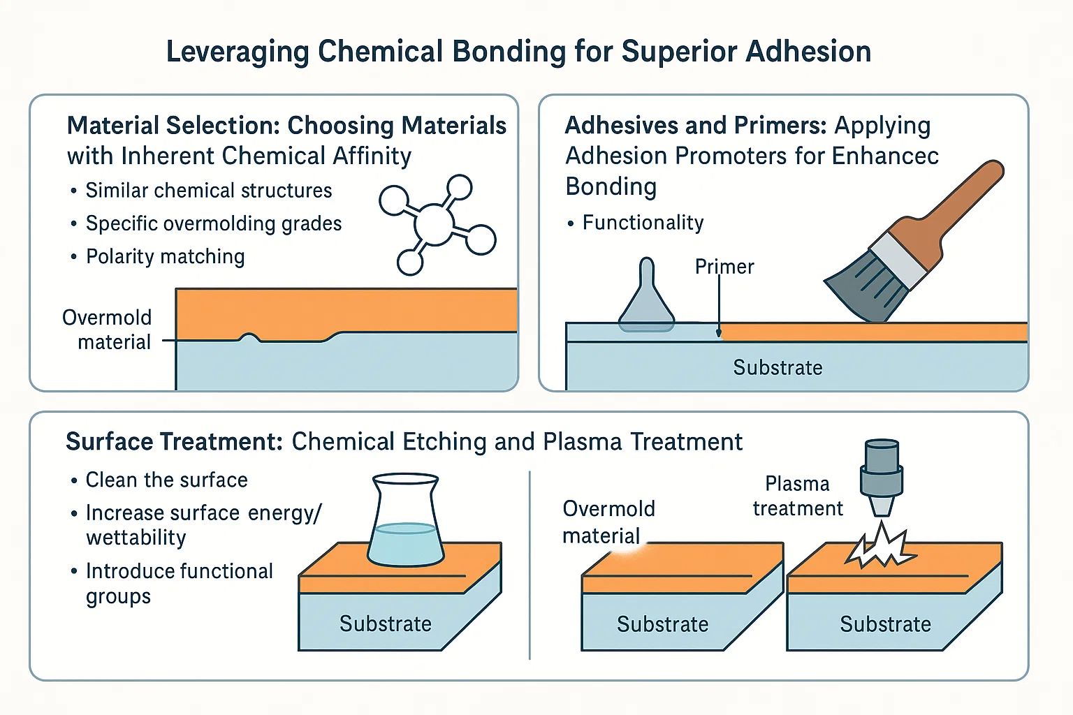 Etsa mekanikal/tekstur: Mewujudkan permukaan kasar mikroskopik pada substrat dapat meningkatkan dengan ketara interlocking mekanikal . Ini boleh dicapai melalui teknik seperti sandblasting, etsa laser, atau bahkan dengan merancang tekstur terus ke dalam acuan tembakan pertama. Kawasan permukaan yang meningkat juga menyediakan lebih banyak mata untuk interaksi kimia yang berpotensi.