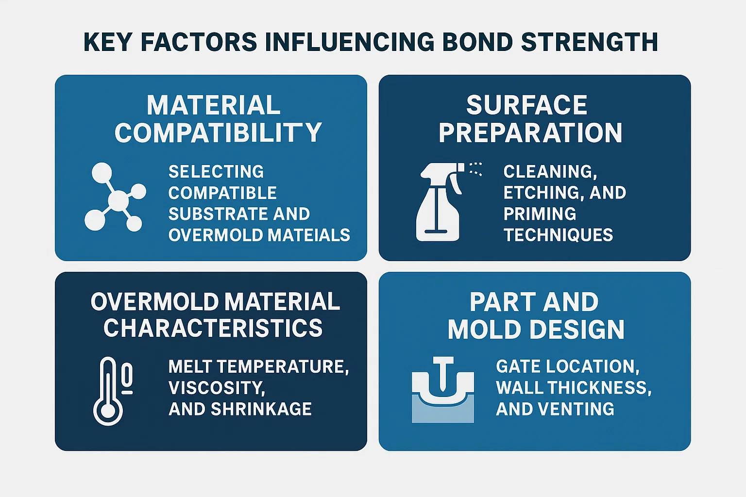 Sifat -sifat bahan overmold itu sendiri memainkan peranan penting semasa proses suntikan.