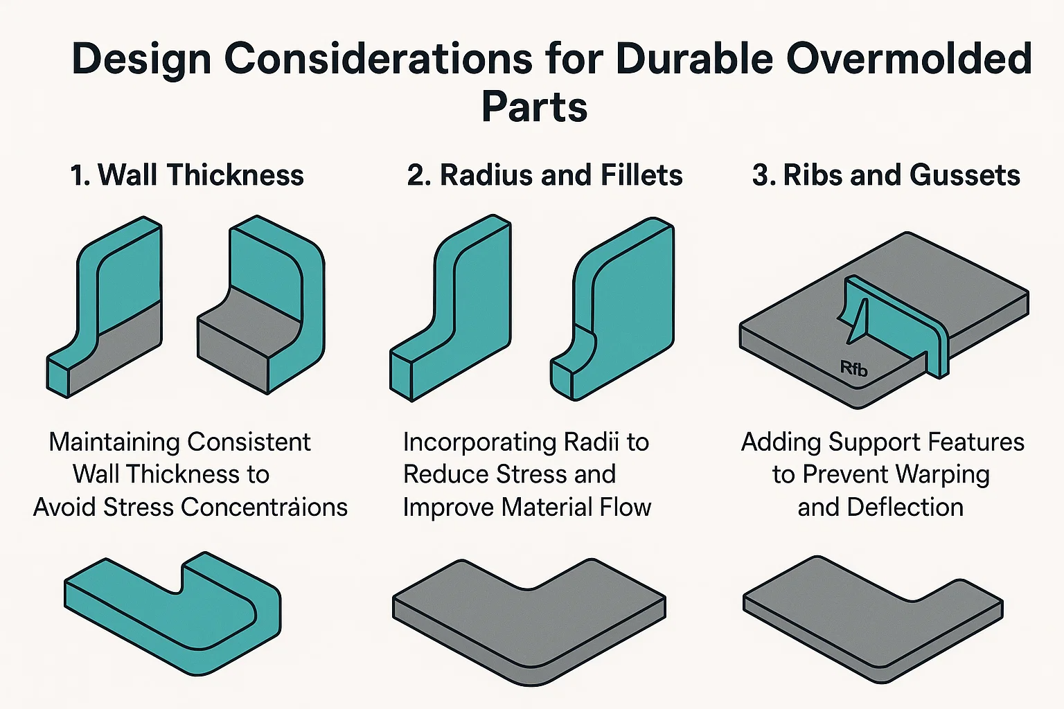Walaupun terutamanya dikenali untuk menambahkan kekakuan dan kekuatan ke bahagian plastik, tulang rusuk dan gusset yang direka dengan betul secara tidak langsung dapat menyokong integriti bon dalam overmolding dengan mencegah ubah bentuk bahagian.