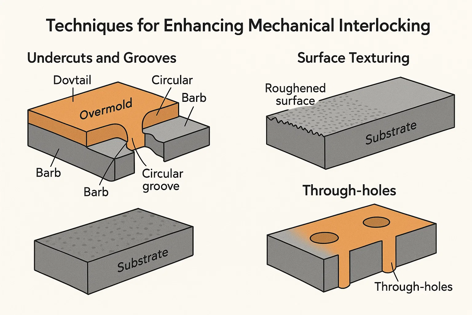 Fikirkan undercuts dan alur sebagai cangkuk mikroskopik atau sauh dalam substrat. Apabila bahan overmold cair mengalir ke dalam ciri -ciri ini dan menyejukkan, ia menguatkan di sekelilingnya, mewujudkan kunci fizikal.