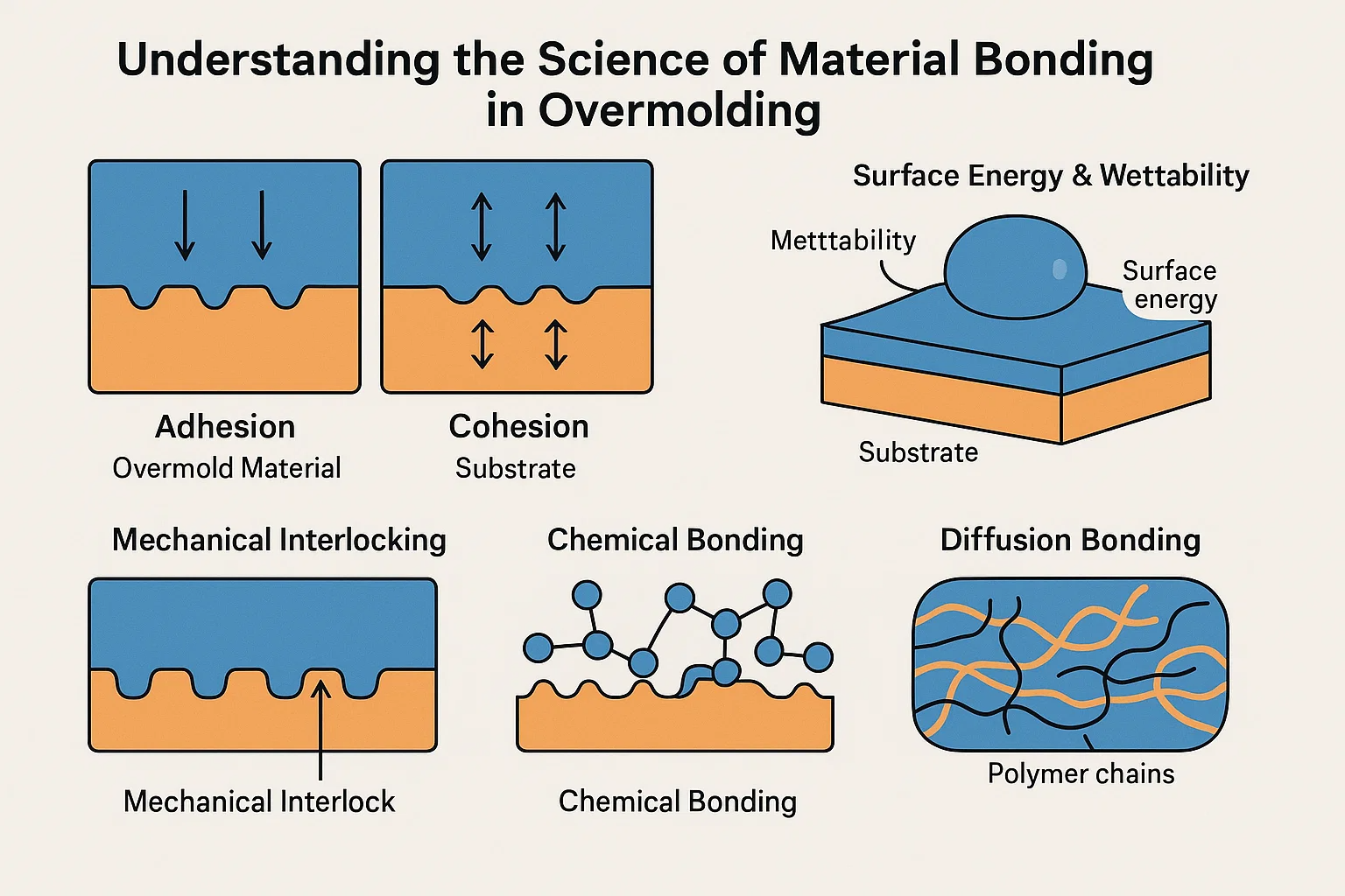 Mencapai ikatan kekal dalam overmolding bukan sihir; Ia adalah sains yang berakar umbi bagaimana bahan berinteraksi pada tahap mikroskopik. Untuk benar -benar menguasai overmolding, kita perlu memahami prinsip asas melekat dan perpaduan , dan bagaimana ia memohon kepada antara muka antara substrat dan bahan overmold dana.