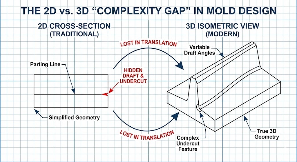 - Ketidakserasian Geometrik: Reka bentuk 2D sering kekurangan data untuk sudut draf berubah-ubah, yang penting untuk pelepasan bersih bahagian plastik kompleks.