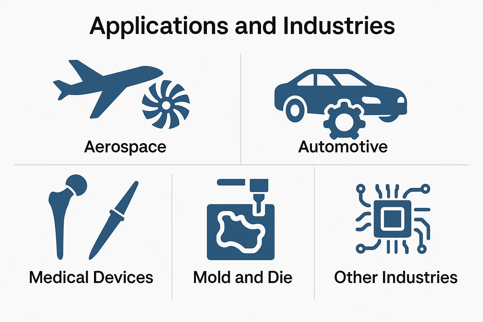 Memandangkan keupayaan lanjutannya, pemesinan CNC 5 paksi sangat diperlukan dalam industri yang menuntut tahap ketepatan dan kerumitan geometri tertinggi. Aplikasinya merangkumi pelbagai: