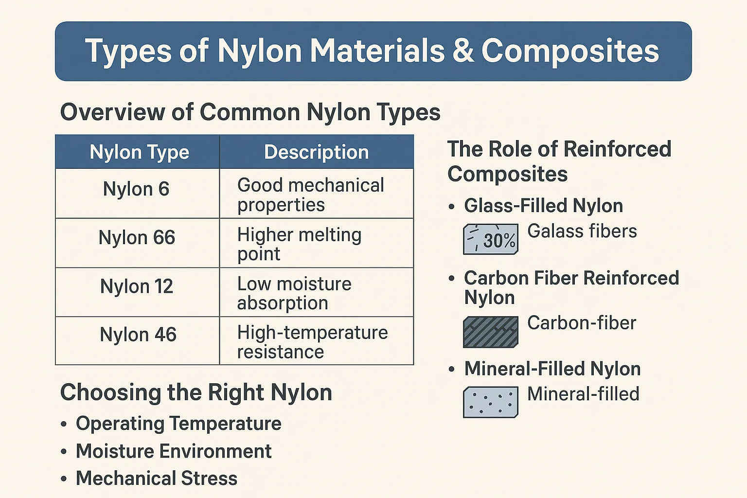 Nylon yang dipenuhi mineral: Digunakan untuk meningkatkan kestabilan dimensi, mengurangkan pengecutan, dan mencapai kemasan permukaan yang lebih lancar, walaupun biasanya dengan perdagangan dalam kekuatan kesan.