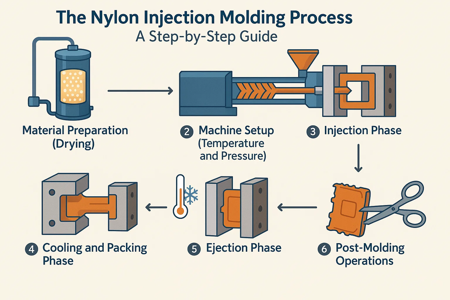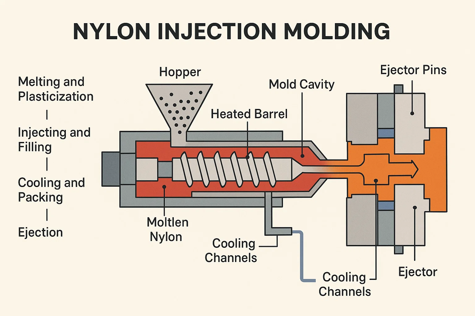 Proses ini pada asasnya sama dengan pengacuan suntikan plastik lain, tetapi ia memerlukan perhatian khusus terhadap suhu, kawalan kelembapan, dan tekanan suntikan disebabkan oleh ciri -ciri bahan unik nilon (khususnya titik lebur yang tinggi dan sifat hygroscopic).