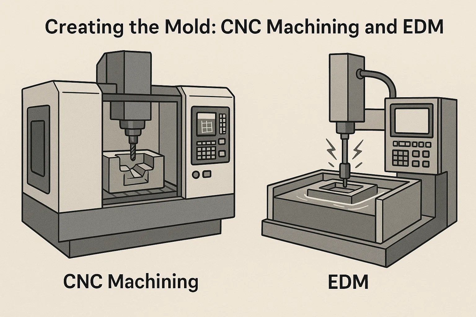 Pemesinan CNC cemerlang dalam mewujudkan sebahagian besar geometri acuan dengan kelajuan tinggi dan ketepatan, membentuk kesan utama bahagian plastik. Walau bagaimanapun, untuk butiran yang sangat baik, sudut dalaman yang tajam, atau ciri -ciri kompleks yang alat pemotongan tradisional tidak dapat dicapai, satu lagi teknik khusus yang dimainkan.
