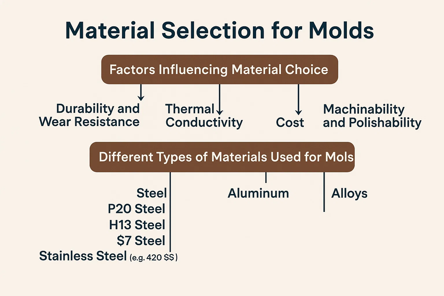 - Rintangan kakisan : Jika bahan plastik yang dibentuk adalah menghakis (mis., PVC), atau jika acuan akan disimpan dalam persekitaran yang lembap, bahan tahan kakisan seperti keluli tahan karat diperlukan.