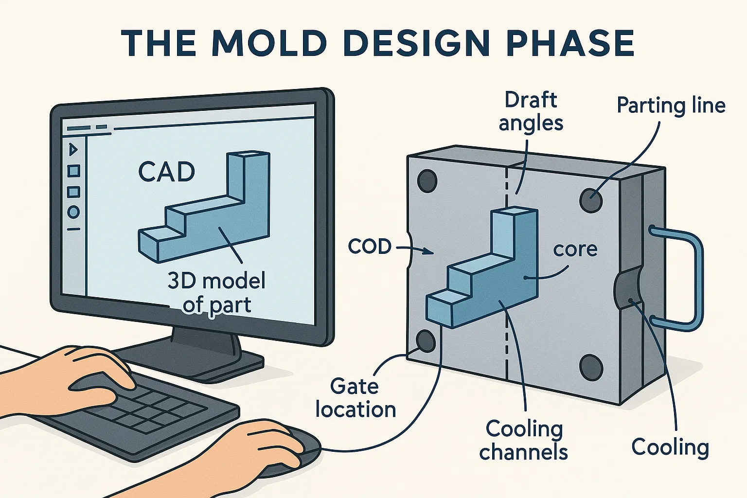 Dengan pemahaman yang jelas tentang bagaimana pengacuan suntikan mengubah plastik mentah menjadi bahagian siap, kini kita dapat menghargai kepentingan utama dari Fasa reka bentuk acuan . Di sinilah sihir benar -benar bermula, sebagai idea abstrak dan lakaran 2D berkembang menjadi pelan tindakan digital yang tepat yang akan membimbing penciptaan fizikal acuan. Ia adalah proses yang teliti di mana setiap lengkung, sudut, dan dimensi bahagian model plastik akhir dipertimbangkan dengan teliti dan diterjemahkan ke dalam geometri acuan.