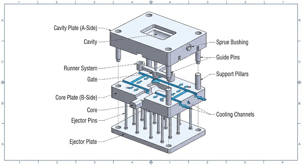 - Rongga dan Teras: Bahagian utama "A" dan "B" yang membentuk bentuk bahagian plastik.