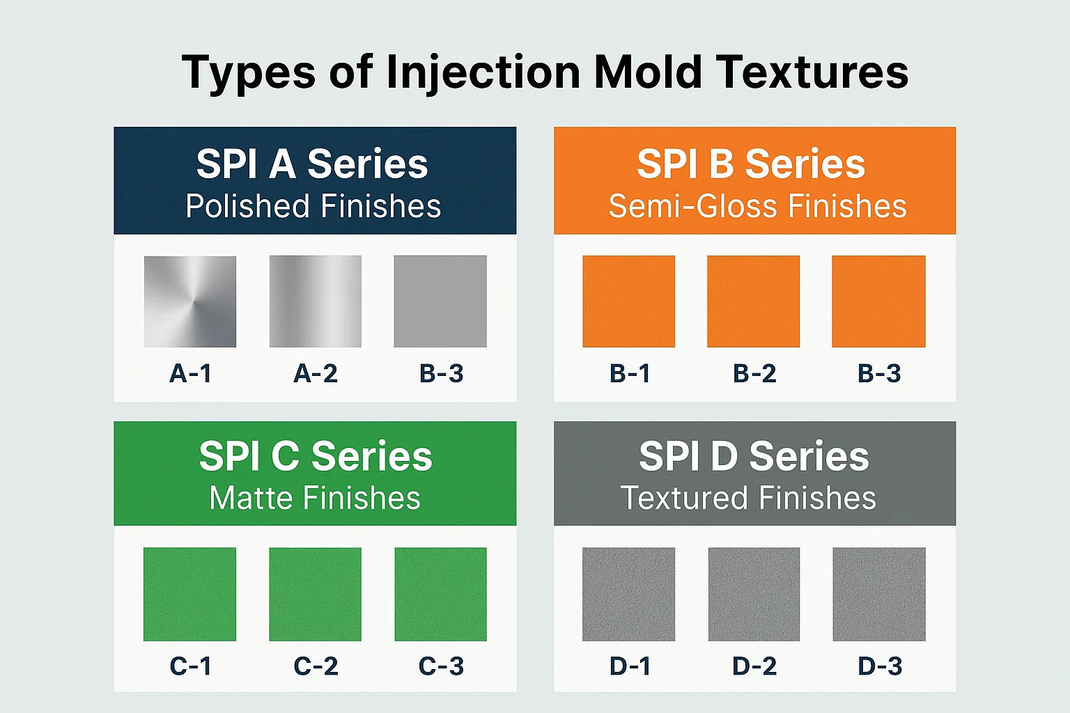 Dunia tekstur acuan suntikan adalah luas, tetapi ia sebahagian besarnya diseragamkan oleh sistem yang dibangunkan oleh Persatuan Industri Plastik (SPI). Memahami piawaian ini adalah penting untuk menentukan kemasan tepat yang diperlukan untuk sebahagian.