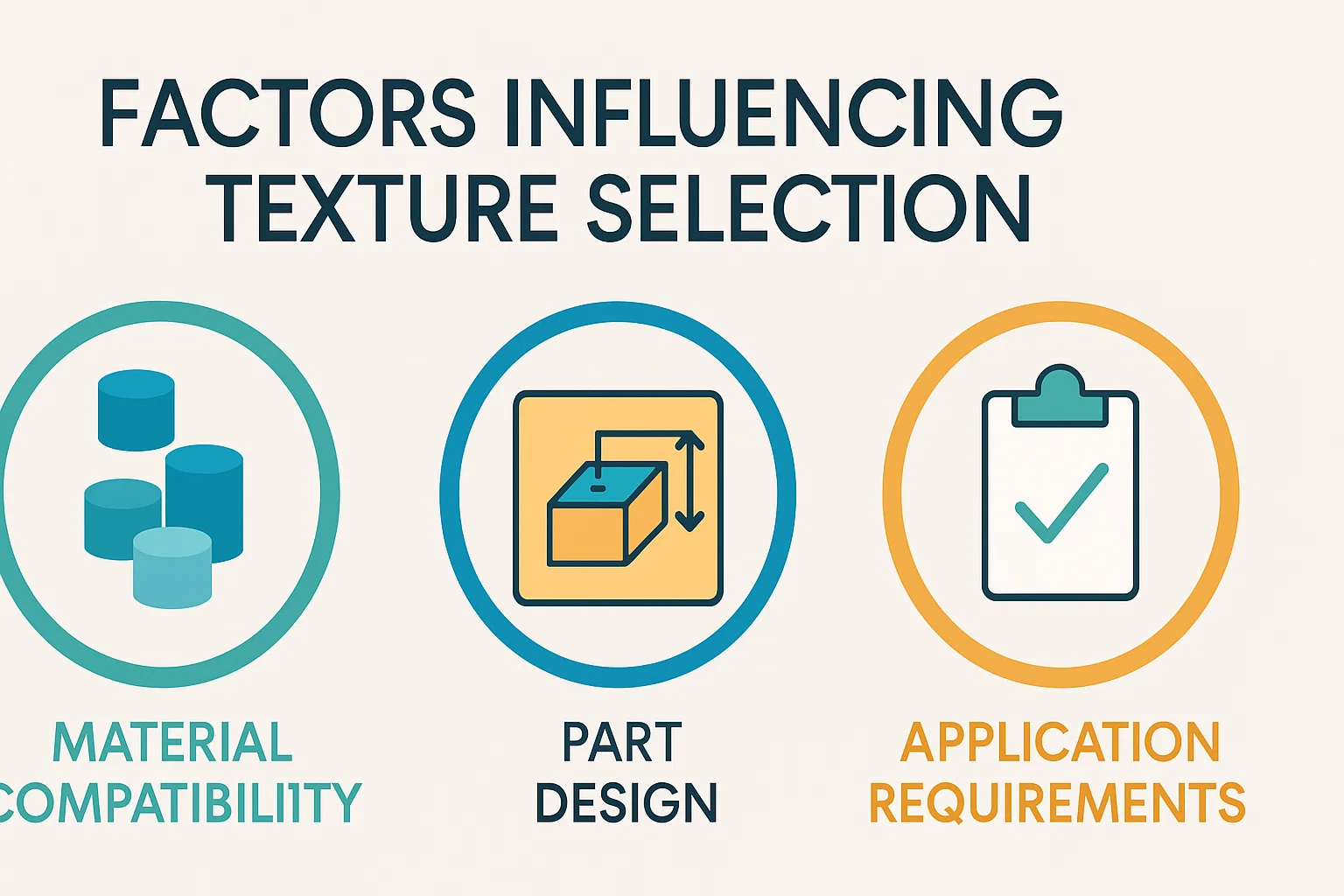 Keseragaman : Adalah penting untuk mempertimbangkan garis perpisahan dan sebarang penutupan cetakan yang berpotensi apabila tekstur. Tekstur mesti digunakan secara seragam di seluruh permukaan untuk mengelakkan ketidakkonsistenan yang kelihatan.