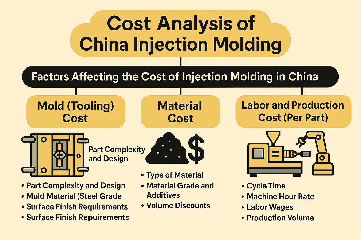 Salah satu motivasi utama bagi syarikat untuk memilih China untuk pengacuan suntikan adalah kelebihan kos yang dirasakan. Walaupun China umumnya menawarkan harga yang lebih kompetitif daripada banyak negara Barat, memahami pelbagai faktor yang menyumbang kepada kos keseluruhan adalah penting untuk belanjawan yang tepat dan mengelakkan perbelanjaan yang tidak dijangka. Jumlah kos projek pencetakan suntikan boleh dikategorikan secara meluas ke dalam kos acuan (perkakas), kos bahan, dan pengeluaran (buruh/mesin).