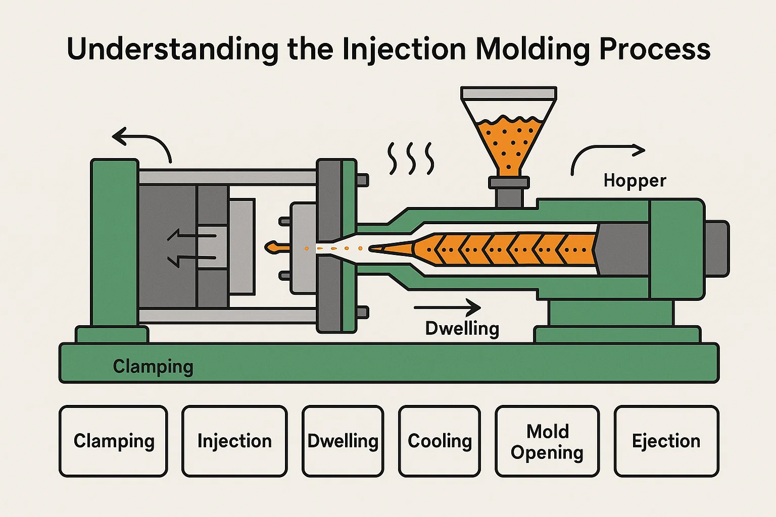 Proses pengacuan suntikan adalah operasi kitaran yang, sambil muncul mudah, melibatkan kawalan tepat suhu, tekanan, dan masa untuk membuat bahagian yang konsisten. Berikut adalah langkah asas: