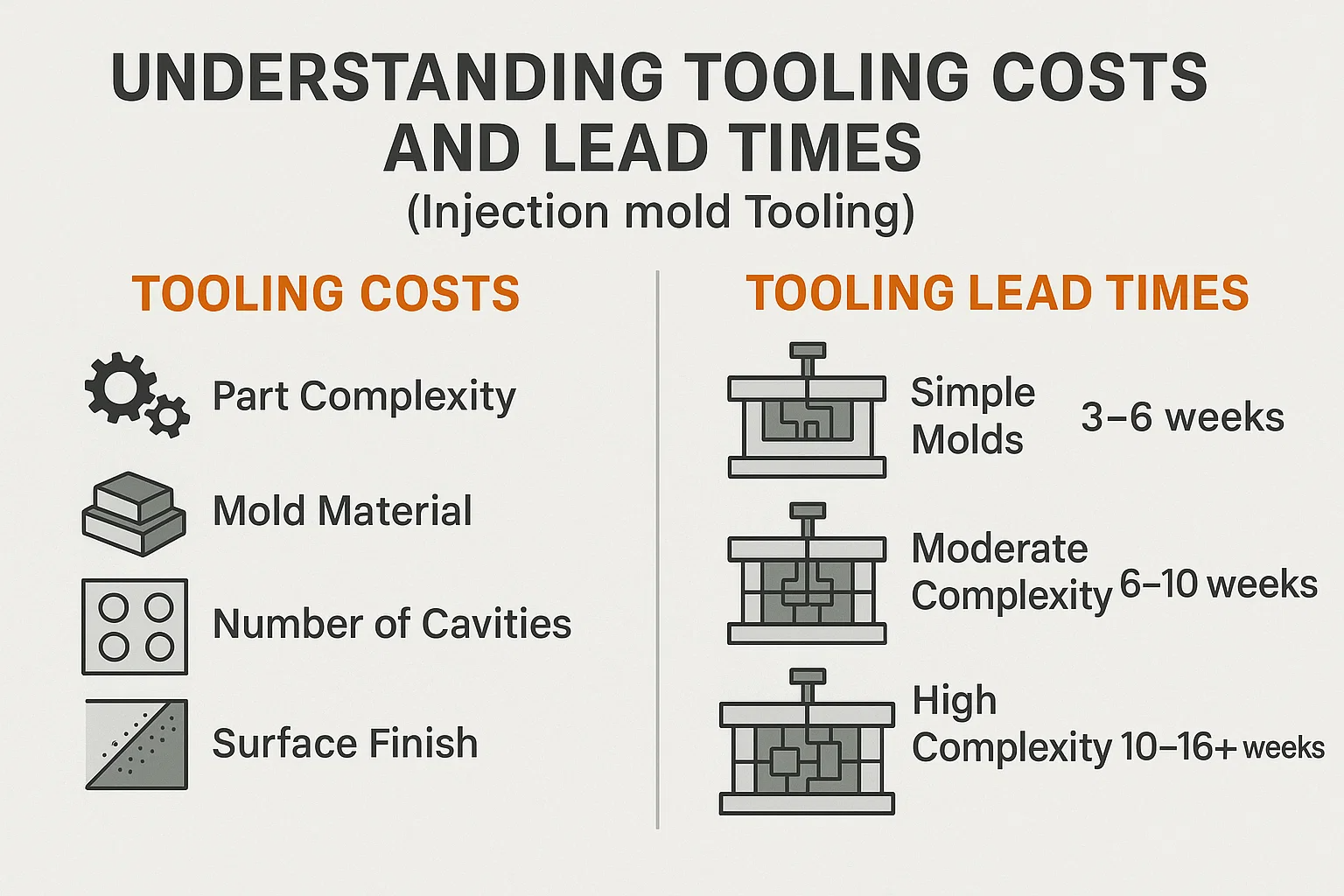 - Waktu memimpin perkakas (seperti yang dibincangkan): Ini adalah masa awal, sering terpanjang, memimpin. Sebaik sahaja acuan selesai dan disahkan, pengeluaran bahagian sebenar boleh menjadi sangat cepat.